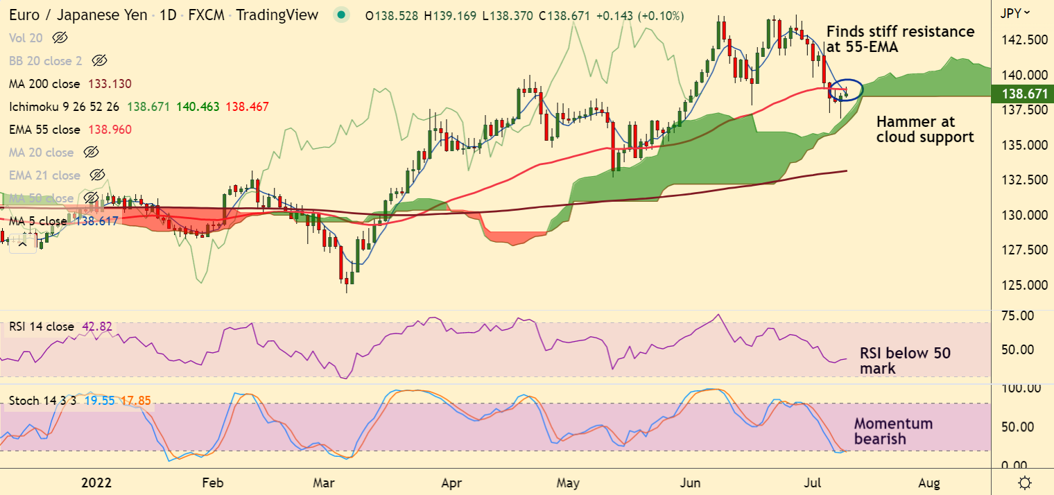 EUR/JPY edged higher after Kuroda's comments, but quickly erased gains. The pair finds stiff resistance at 55-EMA.