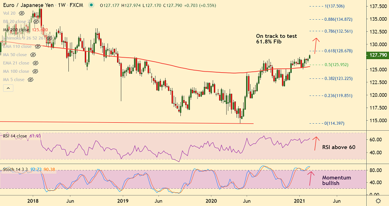 Summary: EUR/JPY is extending winning streak for the 4th straight month. The pair has hit levels unseen since December 2018, just shy of 128 handle. Outlook is bullish, scope for test of 61.8% Fib at 128.67 ahead of 129 handle. Bullish invalidation only below 200W MA.