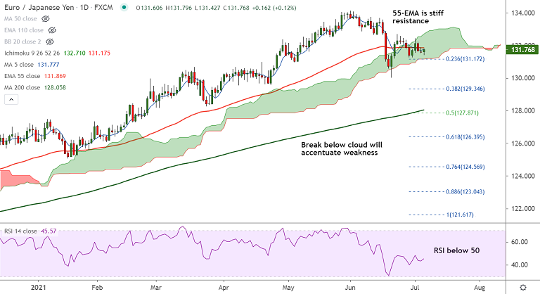 Next major hurdle for bulls lies at 132.10 (Nearly converged 21-EMA and 20-DMA) ahead of 132.71 (cloud top).