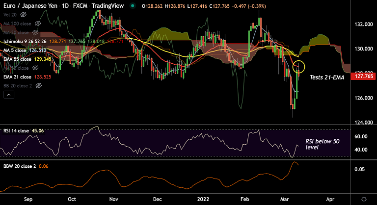 EUR/JPY spiked higher to test 21-EMA at 128.52, hit 7-day high at 128.87 before slipping lower.