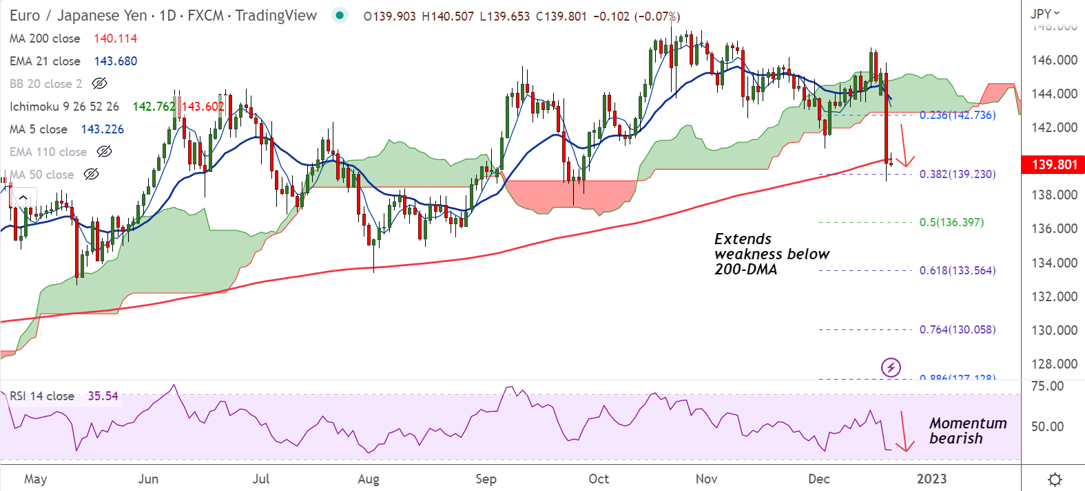 Technical bias for the pair has turned bearish. Price action has slipped below 200-DMA, scope for further downside.