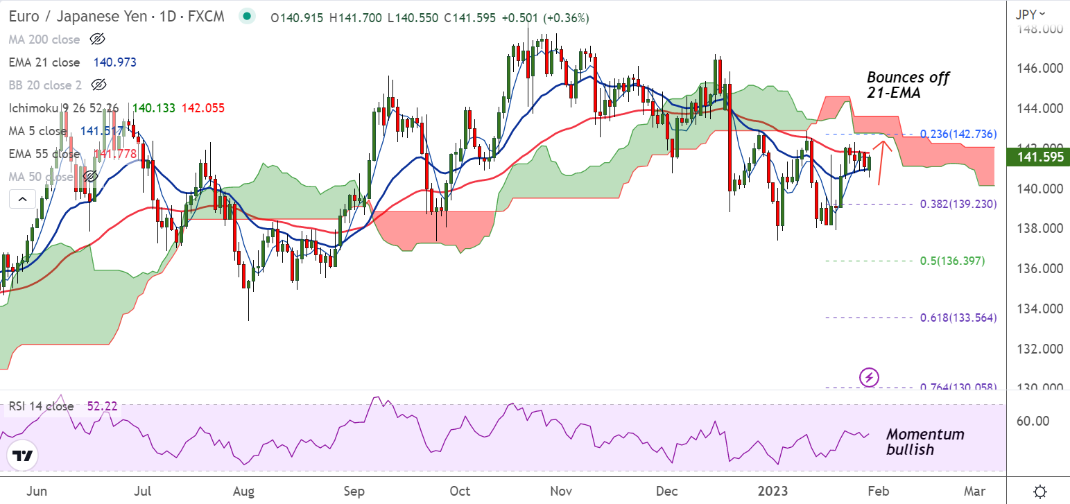 EUR/JPY was trading 0.41% higher on the day at 141.66 at around 10:00 GMT. The pair is holding gains as price action has bounced off 21-EMA support.