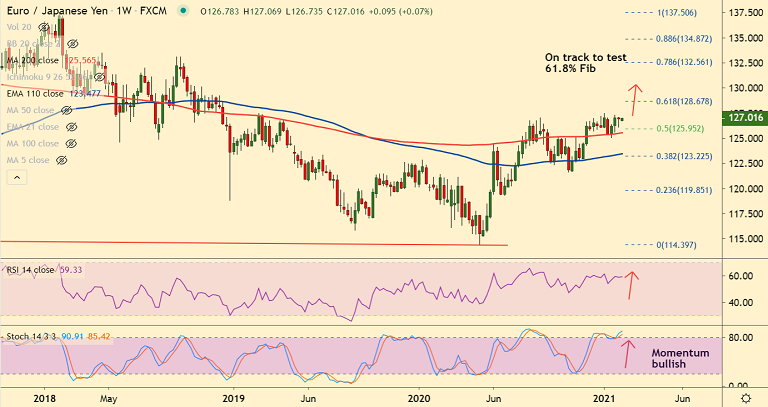 On the flipside, 5-DMA is immediate support at 126.58. Bullish invalidation only below 200W MA.