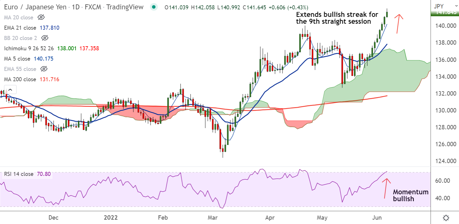 - The pair is extending the bull run for the 9th consecutive session, hits fresh 7-year high above 142 handle