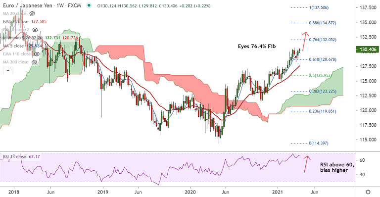 Summary: EUR/JPY trades with a bullish bias. The pair is attempting break above 200-month MA at 130.30 and is trading at 130.51 at around 09:50 GMT. Bullish momentum to carry the pair higher. Scope for test of 76.4% Fib at 132.05.