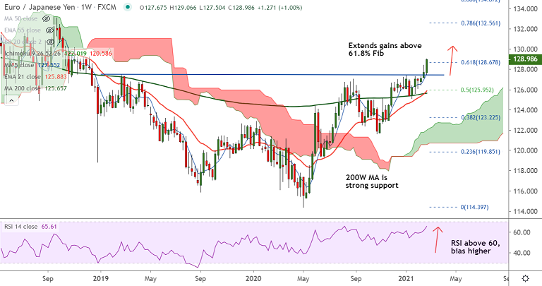 Summary: EUR/JPY trades with a strong bullish momentum. Price action has broken above 61.8% Fib and breakout of monthly cloud will propel prices higher. Scope for test of 200 month MA at 130.33.