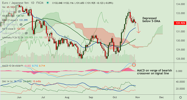 Summary: EUR/JPY poised for further downside. Dip till 21-EMA at 131.38 likely. Breach at 21-EMA will see further downside.