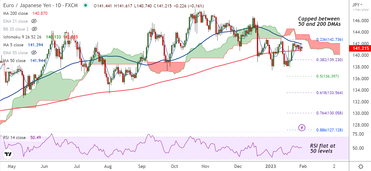 EUR/JPY capped between major moving averages - 50 and 200 DMA, and break out on either side to decide further direction.