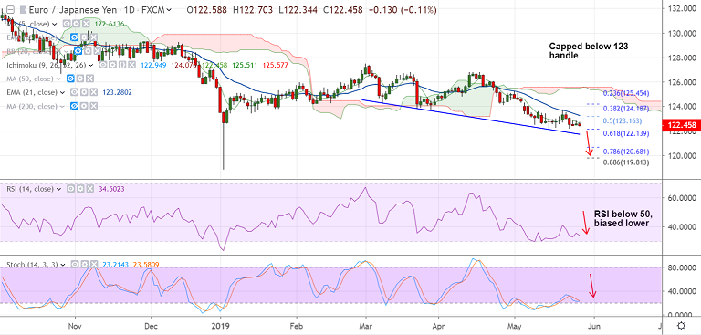 Strong resistance is seen at 123.27 (21-EMA). Bearish invalidation only above 200-DMA.