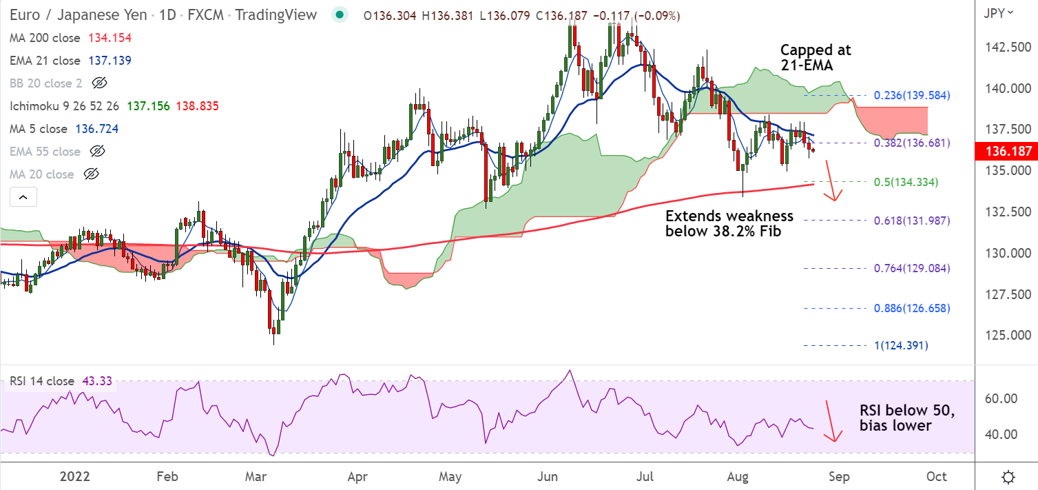 Summary: EUR/JPY trades with a bearish bias. Scope for dip till 200-DMA at 134.15. Bearish invalidation only above 21-EMA.
