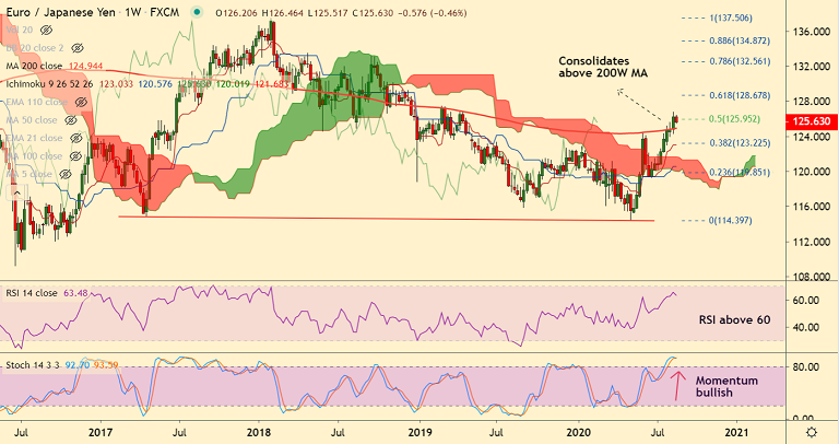 Pullbacks on account of overbought oscillators can see dip till strong supports at 200W MA at 124.94 and 21-EMA at 124.63.