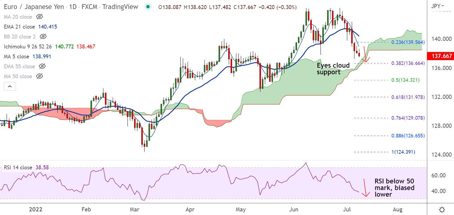 Daily cloud is next major support at 136.63. Break below will see further downside in the pair.