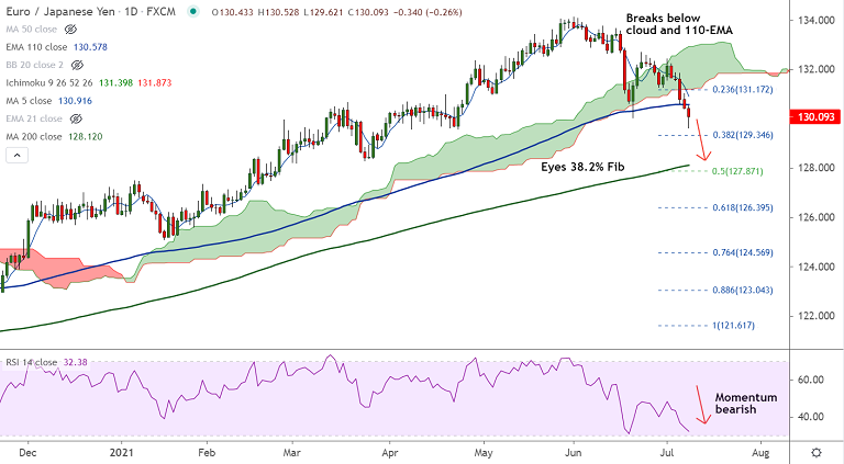 Price action is extending break below daily cloud and 110-EMA, slips below 130 handle, scope for further downside.