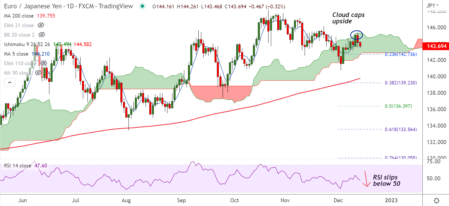 The pair eyes 23.6% Fib at 142.73. Break below daily cloud will see more weakness. On the flipside, breakout above cloud required for upside continuation.