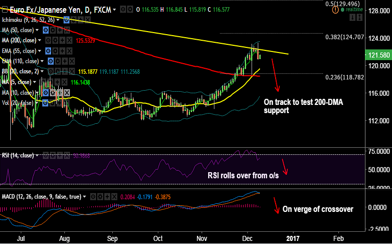 - Indicators on intraday charts have turned bearish, we see scope for test of 200-DMA at 118.45.