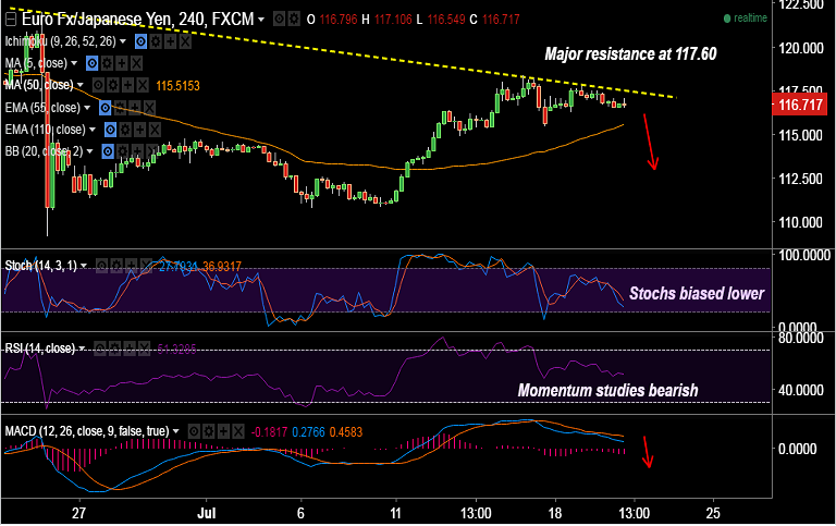 FxWirePro: EUR/JPY fails to hold gains above 117 handle, scope for test of 115.50 levels