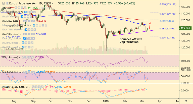 - Next major hurdle above 125.80 lies at 110-EMA at 126.65 ahead of 127.50 (Mar 1 high).