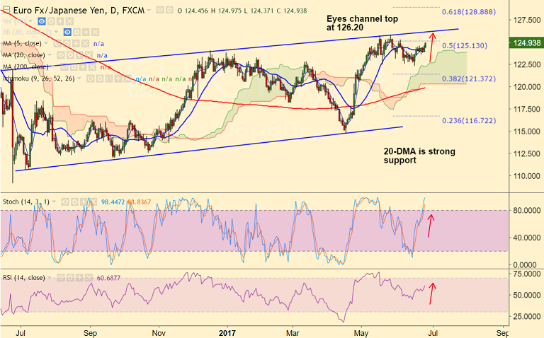 - EUR/JPY trades with a bullish bias, finds strong support at 20-DMA at 123.97.