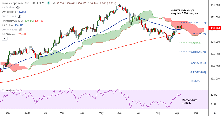 EUR/JPY was trading 0.23% lower on the day at 130.25 at around 09:20 GMT. The pair is extending sideways for the 5th straight session above 55-EMA support.