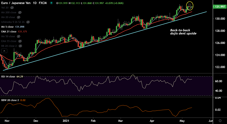 The pair is holding immediate support at 5-DMA at 131.90. Break below will see dip till 21-EMA at 131.17.