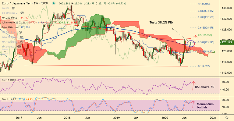 The pair has tested 123.22, 38.2% Fib retracement of Jan 2018 high (137.506) and May 2020 low (114.397).