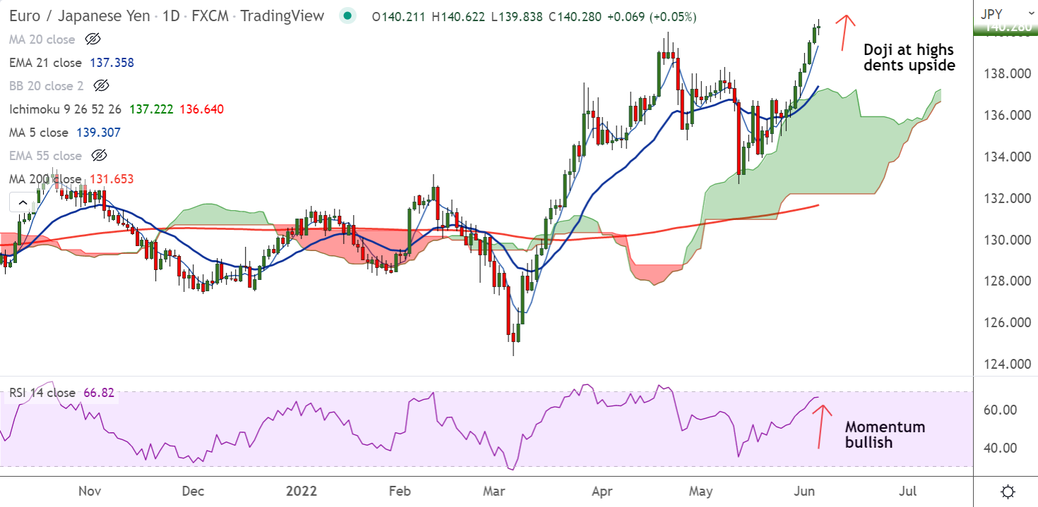 EUR/JPY has potentially peaked and is showing signs of exhaustion. Doji formation shows traders indecisiveness to take prices higher.