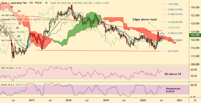 Next immediate hurdle lies at 123.22 (38.2% Fib retracement of Jan 2018 high (137.506) and May 2020 low (114.397). Break above 38.2% Fib finds little resistance till 200W SMA at 124.66.