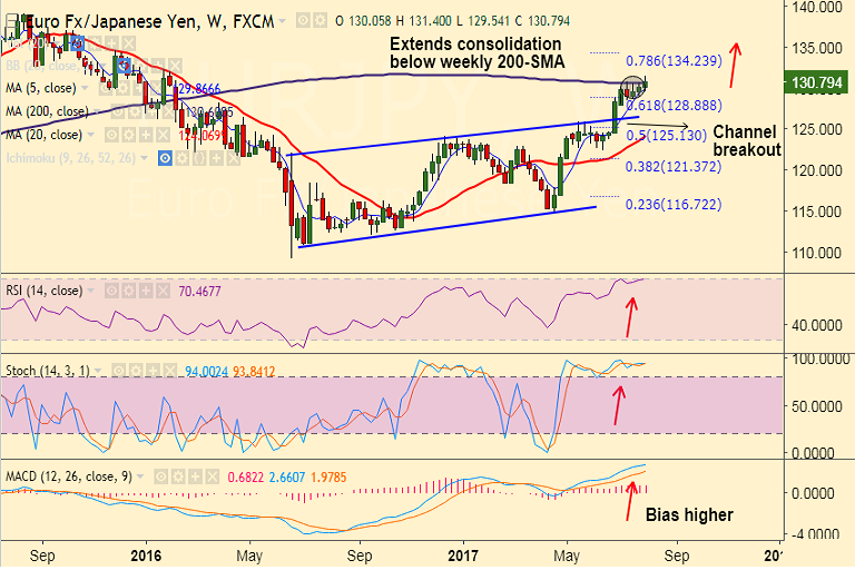 - EUR/JPY has broken consolidation and edged above weekly 200-SMA at 130.60.