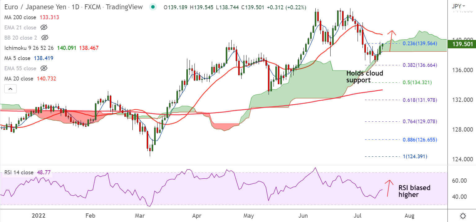 EUR/JPY was trading 0.22% higher on the day at 139.51 at around 11:10 GMT. The pair is extending gains for the 3rd straight session, scope for further upside.