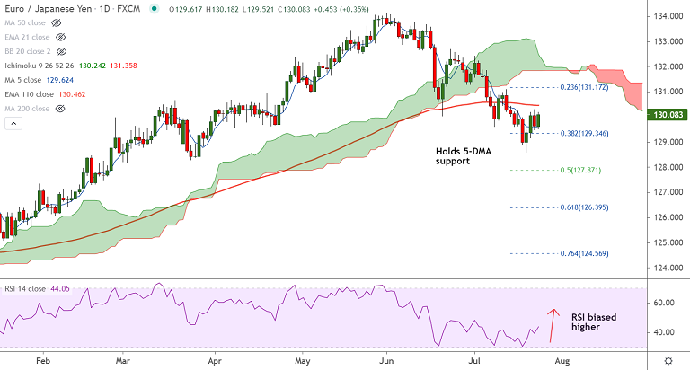 Support - 128.44 (200-DMA), Resistance - 130.46 (110-EMA)