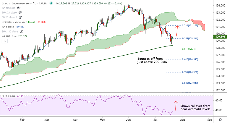 The pair has edged above 5-DMA and is eyeing 200H MA resistance at 130.02. Decisive break above could see carry forward in the upside momentum.