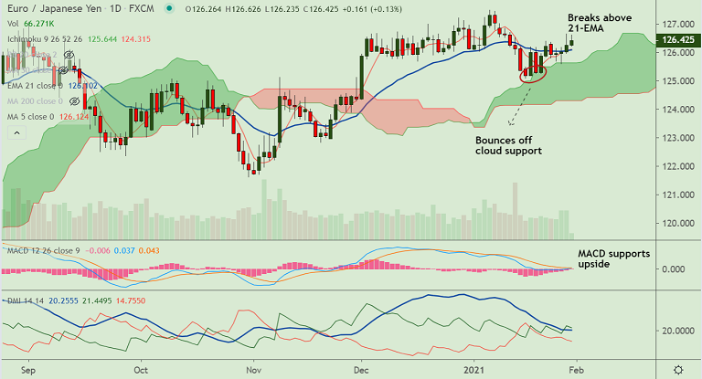 The pair is consolidating trendline breakout. Scope for gains till 61.8% Fib at 128.67. Weakness only below daily cloud.