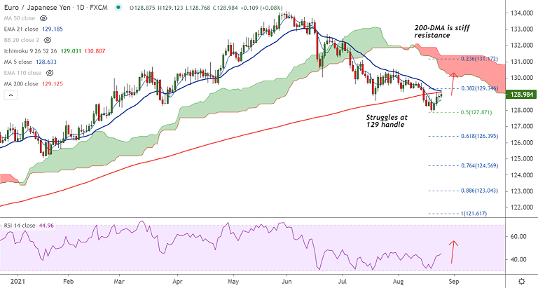 Price action has edged above 200H MA. Stiff resistance is seen at 200-DMA at 129.12, decisive break above will see more upside in the pair.