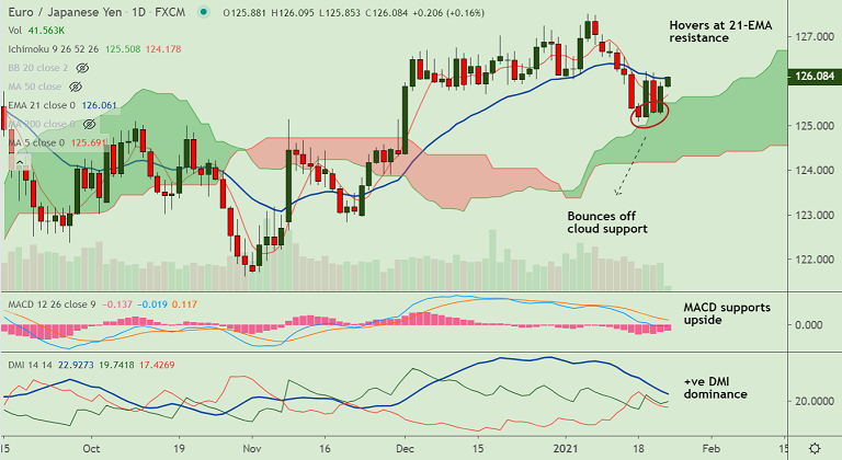EUR/JPY trades with a neutral bias for the day. Price action has bounced off cloud support. 21-EMA offers stiff resistance at 126.06.