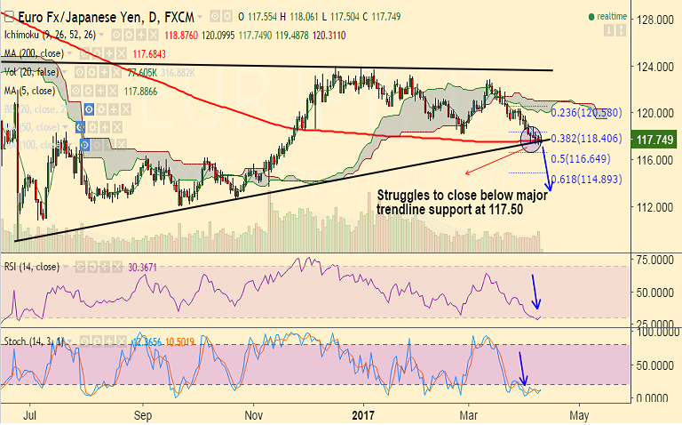 - Technical studies are bearish, pair could accelerate slide on a sustained break through 117.50 support (major trendline).