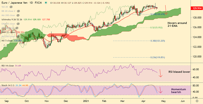 Decisive break below 21-EMA will drag the pair lower. Dip till 55-EMA or daily cloud support likely.