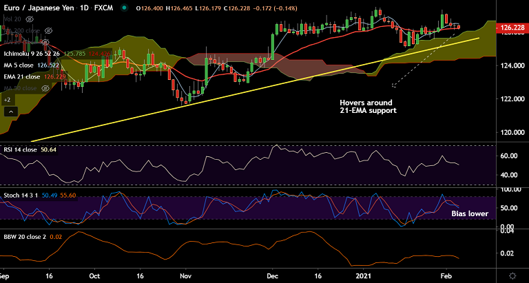 The pair was trading 0.17% lower on the day at 126.18 at around 08:55 GMT, bias remains neutral.