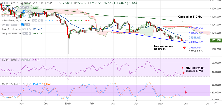 Strong resistance is seen at 123.13 (21-EMA). Bearish invalidation only above 200-DMA.