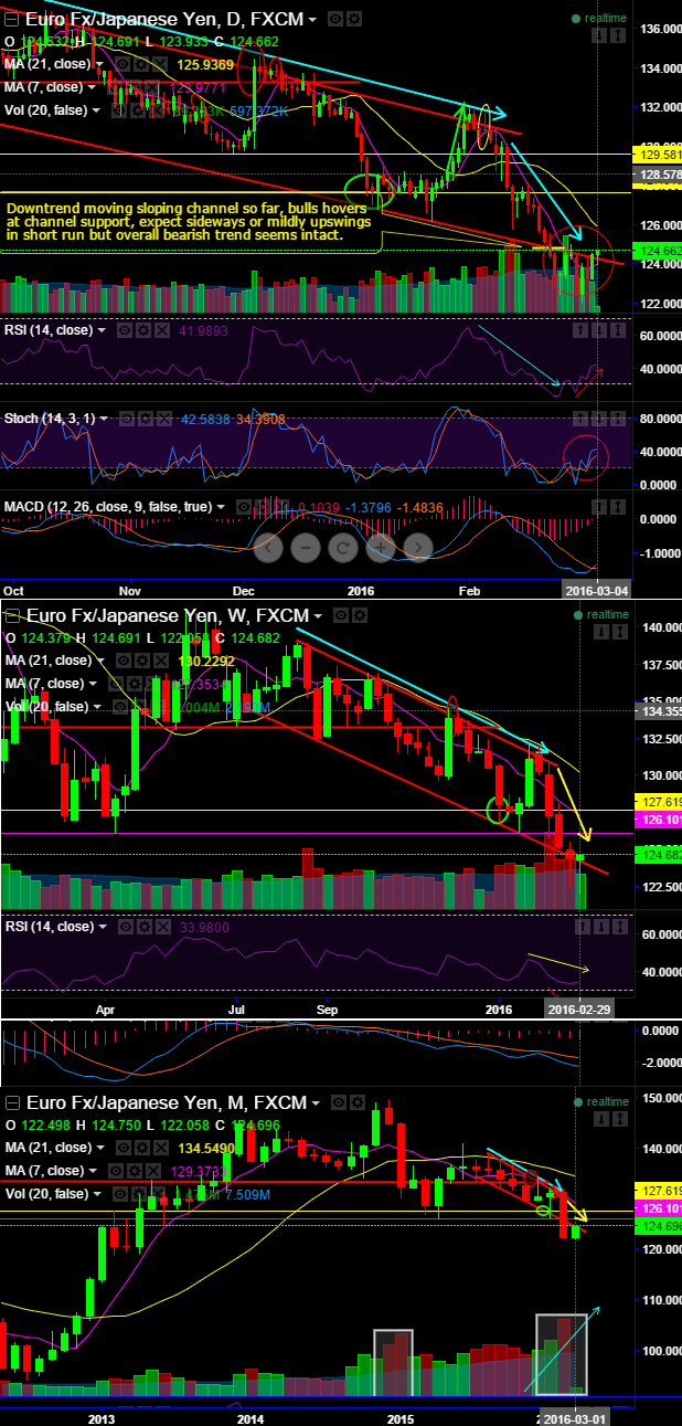 As a result, both weekly and monthly prices have slipped below 10DMA, hence it is perceived as ongoing downtrend would drag further. Currently, attempting to jump above channel support at 124.725 levels.
