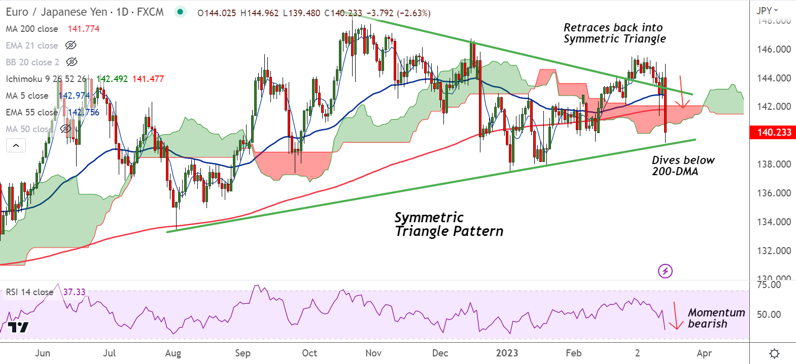 Summary: EUR/JPY retrace below 200-DMA and daily cloud has changed near-term dynamics. Symmetric Triangle base offers immediate support, break below will drag the pair lower.