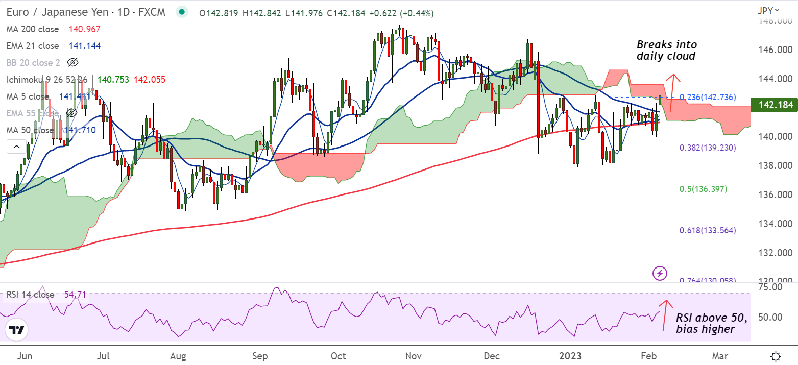 Summary: EUR/JPY trades with a bullish bias. Close above 50-DMA will fuel further upside in the pair. Next major resistance lies at cloud top at 143.60.