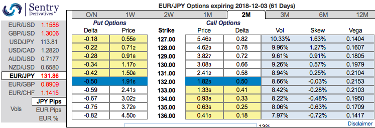 Buy 2m EURJPY ATM -0.49 delta puts for aggressive bears on hedging grounds. If expiry is not near, delta movement wouldn’t be 1 point increase with 1 pip in the underlying spot FX. Which means if the spot FX moves 1 pip, depending on the strike price of the option, the option would also move less than 1.