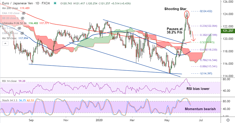 Summary: Major trend is bullish. The pullback on account of overbought oscillators has paused at 38.2% Fib. 200-DMA is major support at 119.48. Further weakness only on break below.