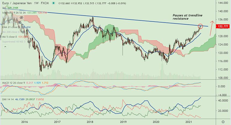 EUR/JPY was trading largely unchanged on the day at 132.71 at around 11:45 GMT, bias bullish.