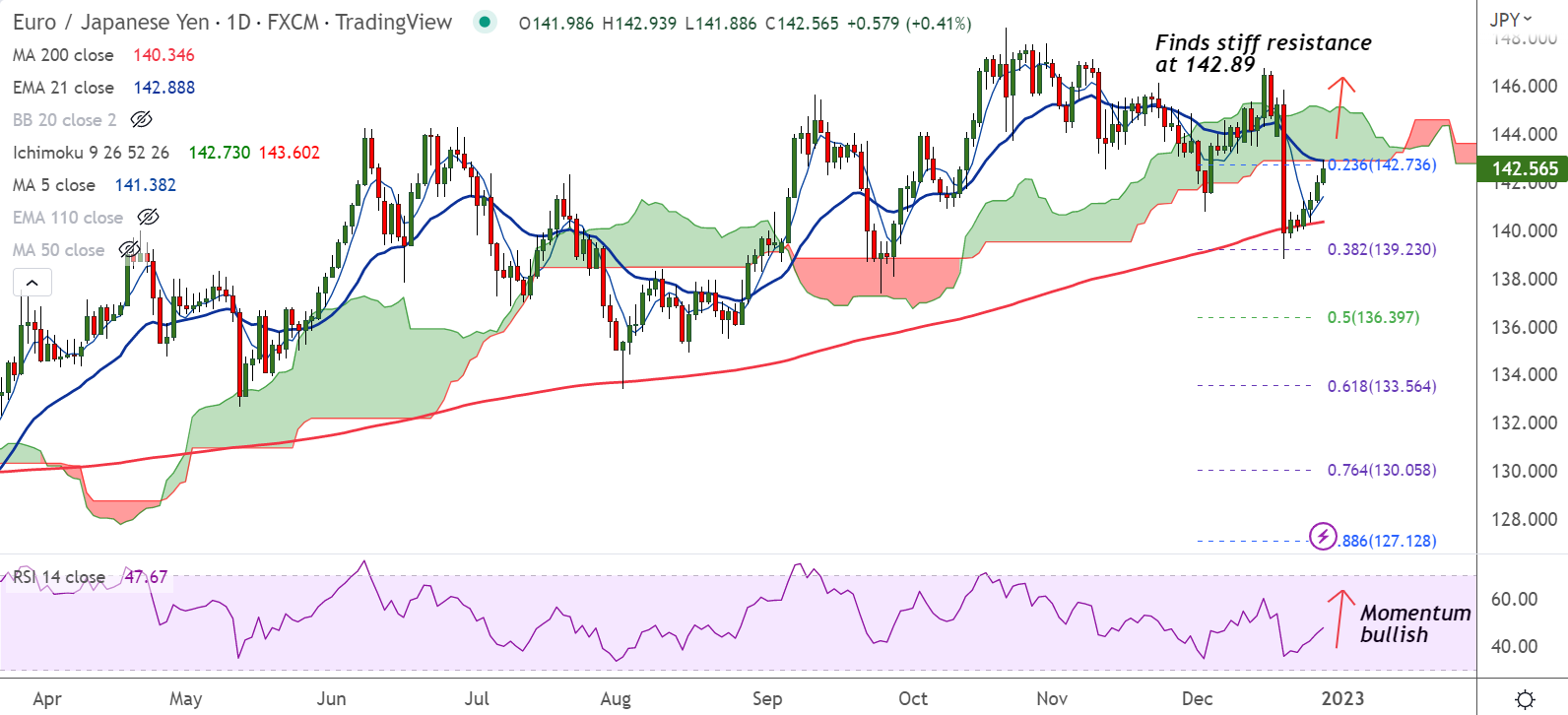 The pair has paused 4-day bullish streak, finds stiff resistance at 142.90 (converged 21-EMA and cloud base).