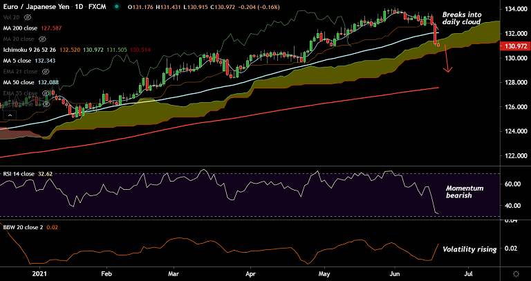 EUR/JPY price action has plunged into daily cloud after breaking 50-DMA support. Scope for test of 200-DMA at 127.58.