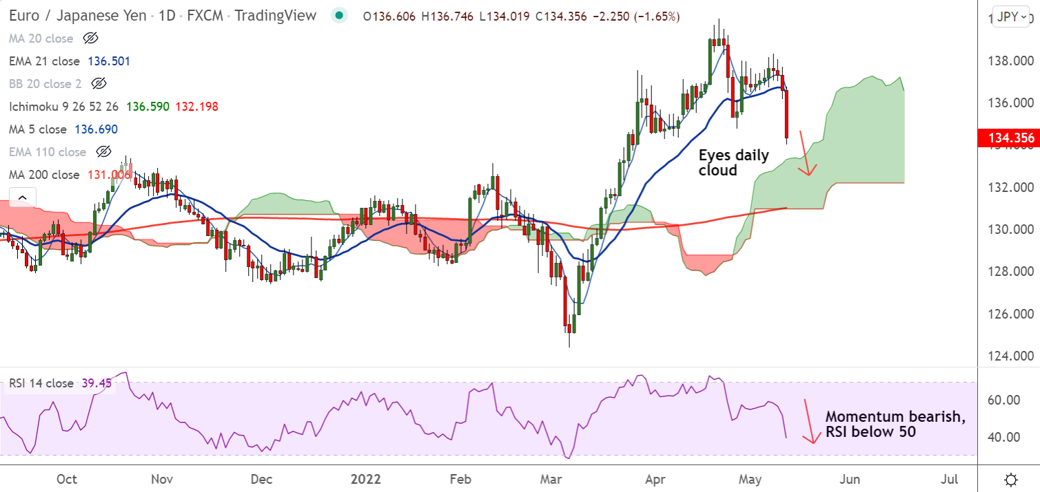 EUR/JPY trades with a bearish bias. The pair is poised to test daily cloud support.