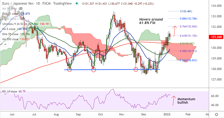 The pair is hovering around 61.8% Fib, scope for test of 133 levels in the near term. Bullish invalidation only below 200-DMA.