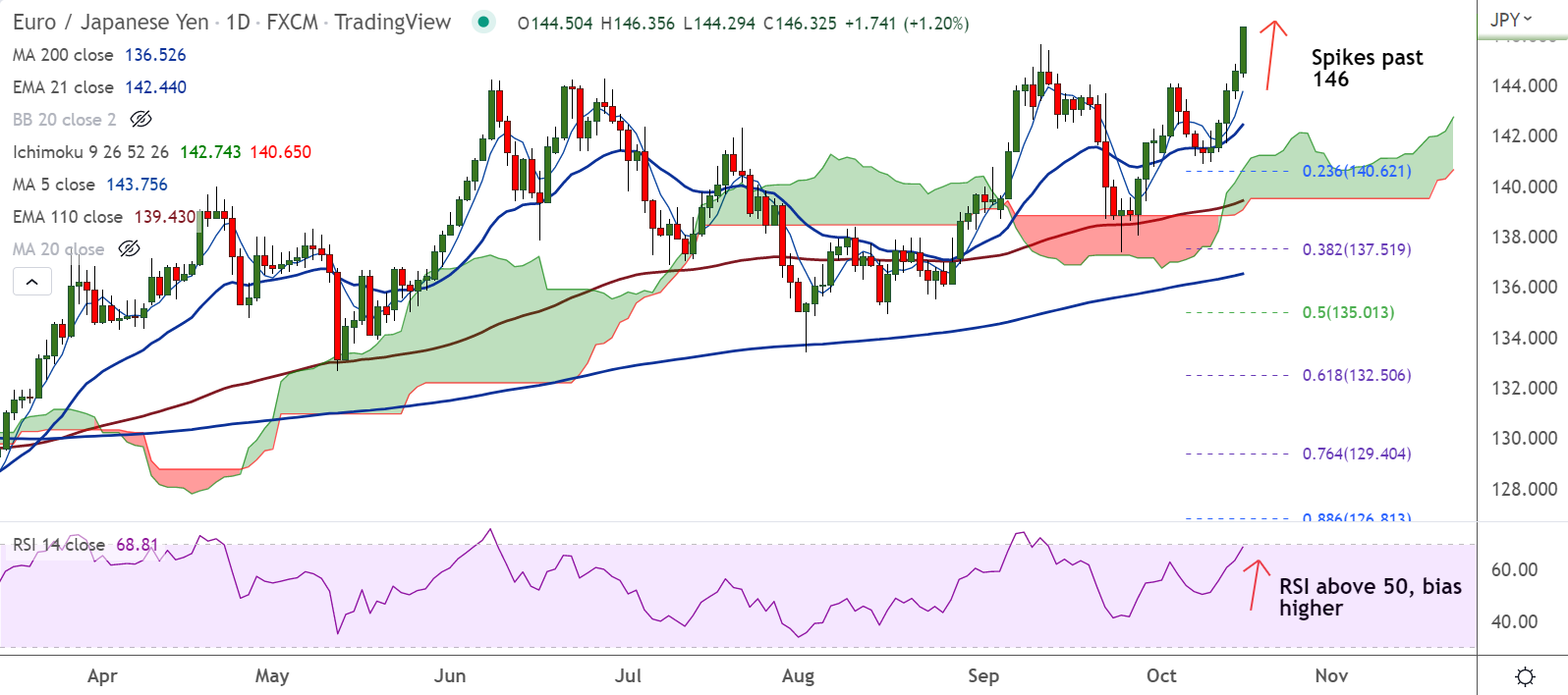 - EUR/JPY was trading 1.28% higher on the day at 146.36 at around 16:00 GMT