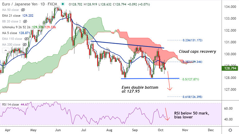 Summary: EUR/JPY trades with a bearish bias. Recovery lacks traction, focus on ECB monetary policy minutes for impetus. Break below 128.34 will see test of 127.95 (Channel base).